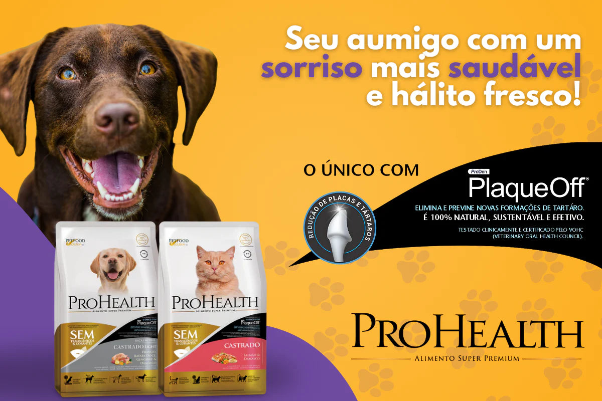 Diga adeus ao mau hálito do seu aumigo com as rações ProHealth, as únicas da América Latina com PlaqueOff! Perfeitas para combater placas bacterianas e tártaro.